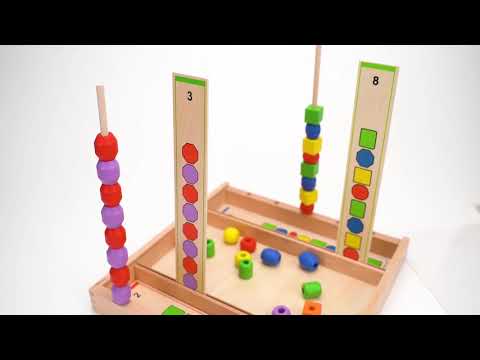 חרוזים צבעוניים כוללים צורות ברורות שקל לידיים הקטנות לתפוס ולזהות צורה וצבע. איחסון קל בדלי. מגוון אפשרויות השחלה עם שרוכים עוזר לשיפור התפתחות מוטורית עדינה, מיומנות תפיסה ותיאום עין-יד. מכיל: 90 חרוזי עץ ו5 שרוכים.